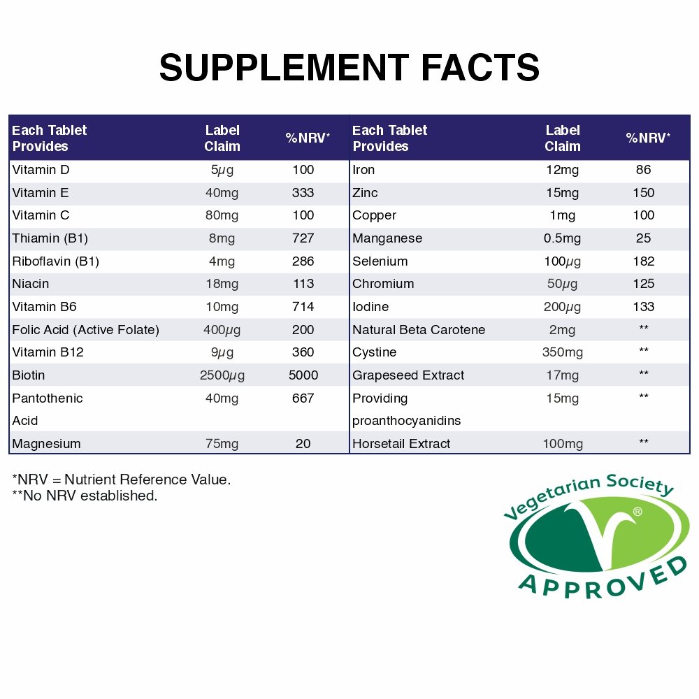 INGREDIENTS: Vitamin D3, Vitamin E (as D-Alpha Tocopheryl Acid Succinate), Vitamin C (as Ascorbic Acid), Vitamin B1 (as Thiamine Mononitrate), Vitamin B2 (as Riboflavin), Niacin (as Nicotinamide), Vitamin B6 (as Pyridoxine Hydrochloride), Folate (as Methyltetrahydrofolate), Vitamin B12 (as Methylcobalamin), Biotin, Pantothenic Acid (as Calcium Pantothenate), Magnesium (as Magnesium Oxide), Iron (Ferrous Fumarate), Zinc (as Zinc Oxide), Copper (Copper Sulphate), Manganese (as Manganese Sulphate Monohydrate), Selenium (as Sodium Selenite Triturate), Chromium (as Chromium Chloride Hexahydrate), Iodine (Potassium Iodide), Natural Beta Carotene, Cystine (as L-Cystine), Grapeseed Extract, Horsetail Extract, Bulking Agents (Calcium Carbonate, Microcrystalline Cellulose, Croscarmellose Sodium), Anti-Caking Agents (Silicon Dioxide, Magnesium Stearate, Stearic Acid), Glazing Agents (Hydroxypropyl Methyl Cellulose, Talc), Colour (Red Iron Oxide).