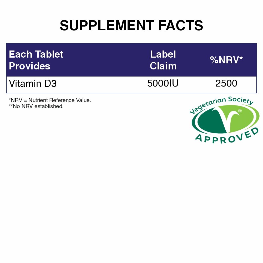 INGREDIENTS: Bulking Agents (Calcium Carbonate, Microcrystalline Cellulose), Vitamin D3 (as Cholecalciferol), Anti-Caking Agent (Magnesium Stearate).