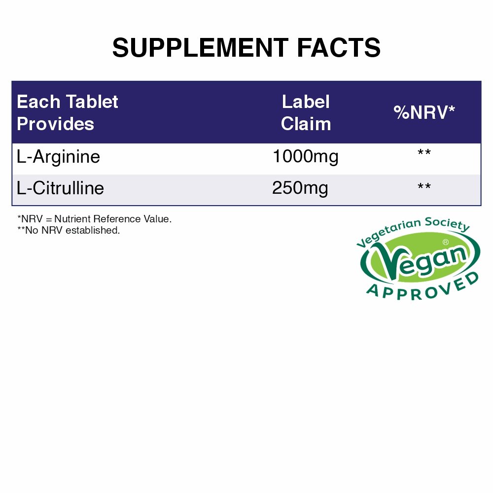 INGREDIENTS: L-Arginine, Bulking Agent (Calcium Carbonate), Binding Agent (Povidone), Disintegrant (Croscarmellose Sodium, Crospovidone XL10), Glidant (Colloidal Silicon Dioxide), Lubricant (Magnesium Stearate), Coating (HPMC, Propylene Glycol, Ethyl Cellulose, Calcium Carbonate, Purified Talc).